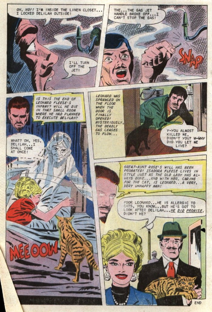The second story was drawn by Charles Nicholas and inked by Vince Alascia, and the art is a bit less polished, more posed and lifeless. It’s really not very good at all. The story is another bunch of forgettable, familiar nonsense. An old woman on her deathbed insists that her grand-niece Isadora and her husband, Leonard Fleese (a pretty great name, there) must take care of her cat Delilah in order to inherit her wealth. Fleese hates the animal and plans to have it euthanized as soon as he’s gotten his hands on wife’s Aunt’s dough. He tries to arrange a natural-seeming death for the cat by locking it in closets for long strings of time, but the darned thing always seems to be able to escape.