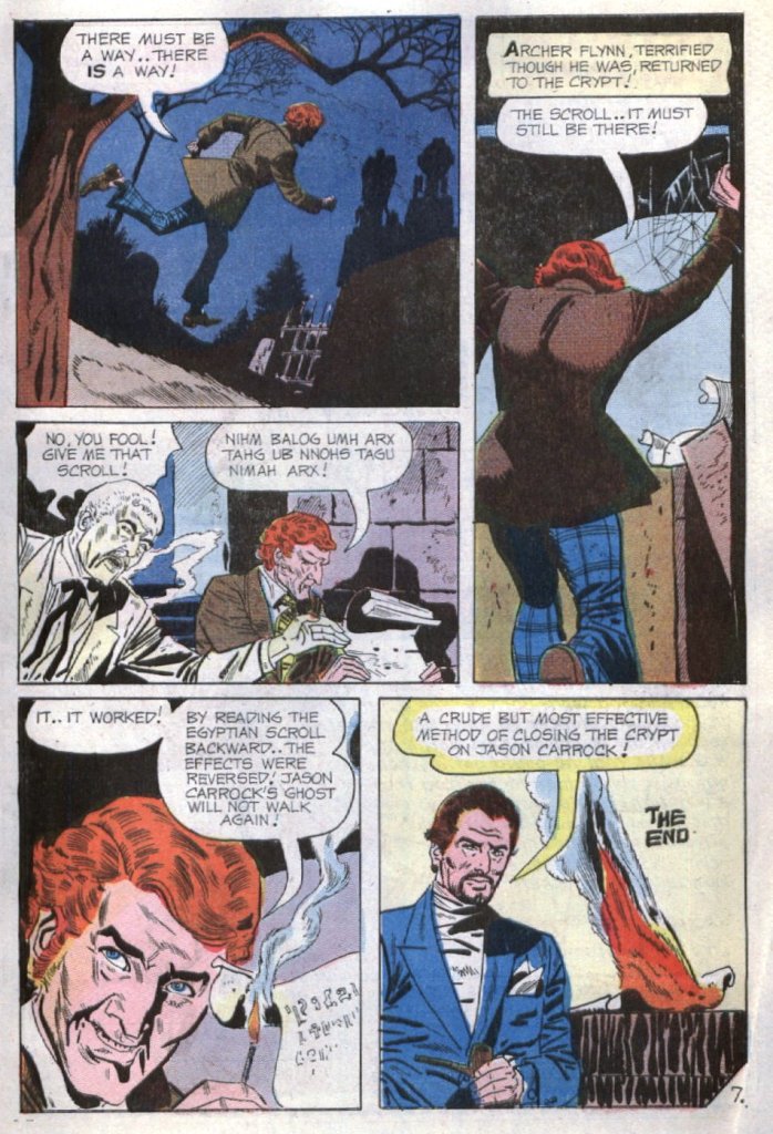In the years since his death, Carrock’s wife has remarried and she and her daughter are living happily in their old home. when he was alive, all Carrock cared about was making money–and seeing how his family has prospered after his demise and how they’re enjoying his former wealth irritates him. He begins to put things right as an unseen spirit, cutting off her daughter’s phone line when she talks for too long, lowering the thermostat and generally behaving like a nuisance. They realize that the spell that Archer recited must have freed Carrock’s spirit, so the writer dashes back to the crypt and reads it again–in reverse! This succeeds in returning Carrock’s restless spirit to his grave, and all is thereafter well. And that’s it. Once again, the stakes here are slight, and the resolution pat. Nobody’s taking home any Eisner Awards for this one.