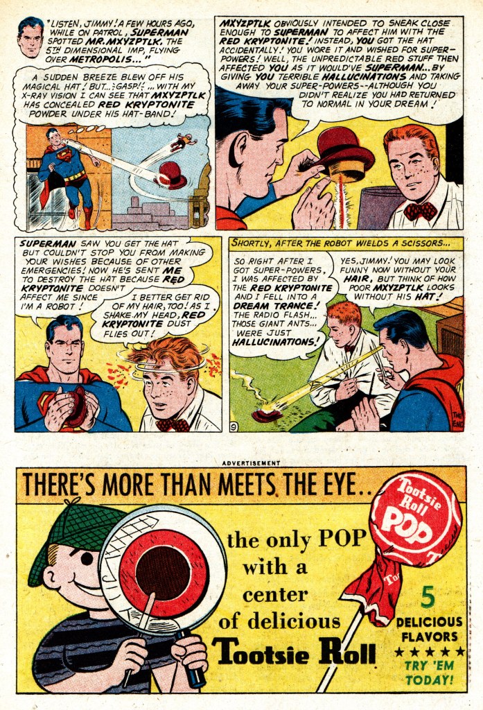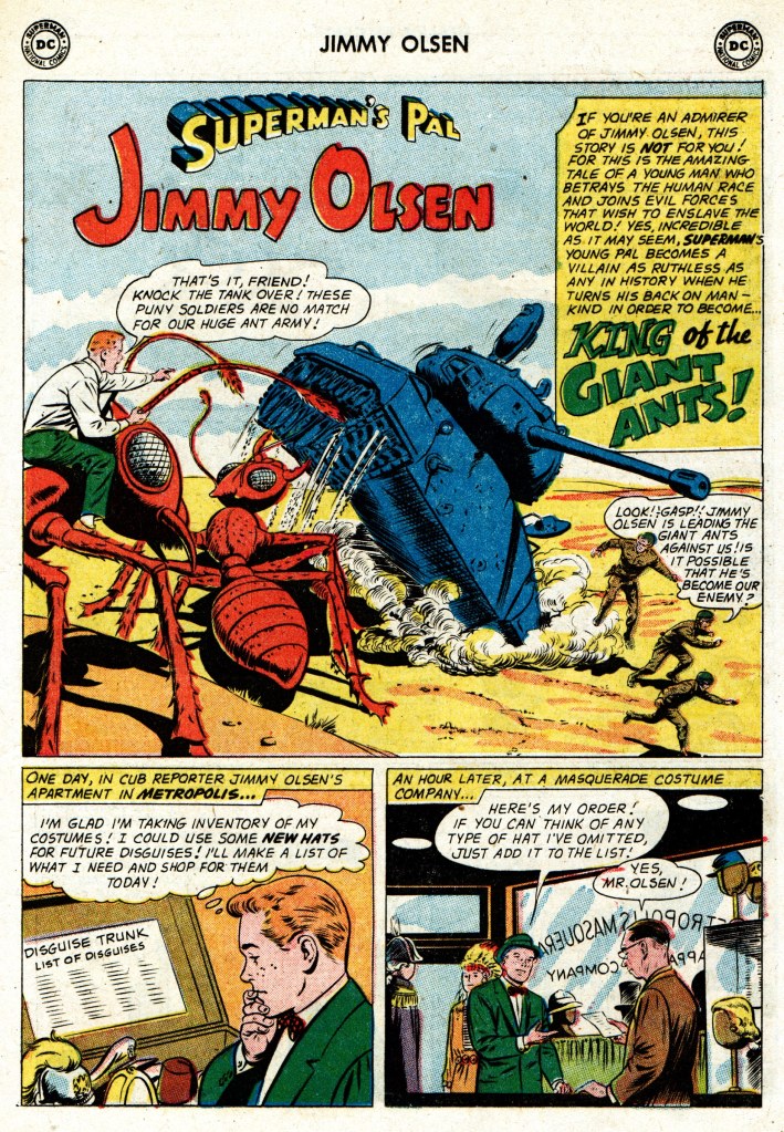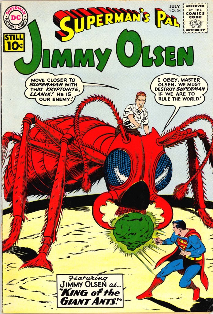 It’s a good thing that Jimmy now has super-powers as it turns out, as he soon spots Professor Lang being menaced by some giant ants that he’s discovered. The ants are malevolent, but Jimmy’s powers give him teh upper hand–until the ant leader reveals that they’ve got Superman a prisoner, held under the influence of kryptonite. The ants force Jimmy to lead their attack on civilization, which he does, until he’s able to make a break for it and rescue his pal. But at a crucial moment, Jimmy’s super-powers wish wears off, and he’s hypnotized by the ant leader to serve him. Jimmy instructs the ant that he is riding to bring the kryptonite closer to Superman, as he’s doing on the cover of the issue, finishing the Man of Steel off. And that’s when one of Superman’s robots wakes Jimmy up. Yes, much of this has been a dream sequence–but not just any dream. You see, Mxyzptlk had secreted some Red Kryptonite within his hat band, and so when Jimmy gained his super-powers, while he wished that Green-K wouldn’t affect him, he said nothing about Red-K. And the way the strange substance affected Jimmy was to cause him to black out and have these vivid hallucinations. Superman sent a robot to roust Jimmy because he himself would be vulnerable to the Red-K. Yeah, it’s a tremendous cop-out, but far from the worst transgression of this sort that Mort’s books would engage in.