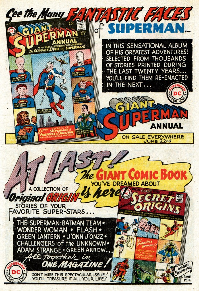 Pretty sure I’ve posted this Ira Schnapp ad for a pair of upcoming DC Annuals before with some other contemporaneous comic book, but it’s too good not to showcase again. In particular, that first SECRET ORIGINS Annual was a much-desired publication by fans of the Silver Age era, containing a number of key stories.