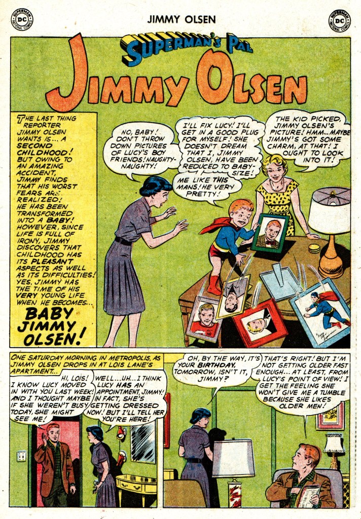 The author of the final story in this issue is uncertain, but it was once again drawn by Curt Swan. And it continues Weisinger’s strange interest in having his characters transformed back into babies. Seriously, I don’t know what it was all about, but if you were a character in the Superman titles, you could expect yourself to be de-aged back to toddlerhood, likely several times. There must have been something to this idea that caused readers to react well to it, because Mort id it again and again, regardless of the series. It all starts with Jimmy becoming aware that his would-be girlfriend Lucy Lane prefers older men. That’s no problem for Jimmy, who has some of Professor Potter’s aging serum left over from an earlier adventure. Unfortunately, the serum has gone bad, and de-ages Jimmy into a child.