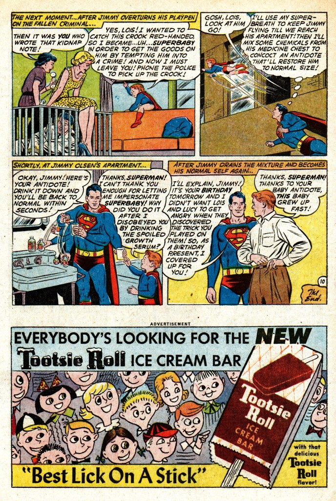 Hoping that Lois Lane has access to an antidote since she wrote up the story about the previous use of the serum, Jimmy heads over to the apartment Lois shares with her sister Lucy. And hilarity ensues, as the pair assume that the now-child Jimmy was teh victim of a kidnapping. What’s more, Lucy’s older beau turns out to be a criminal in disguise, and he winds up abducting Olsen for real. Fortunately, Jimmy is able to flag down Superman with his playsuit’s cape, and the Man of Steel obligingly not only doesn’t scold him for his misuse of the serum, but uses his powers to make it appear that Jimmy is super-powered and has become a baby to locate and take down the criminal. What a pal! Of course, none of this really makes much sense outside of teh wacky world of Weisinger, but again, it was all done in an entertaining and daffy fashion.