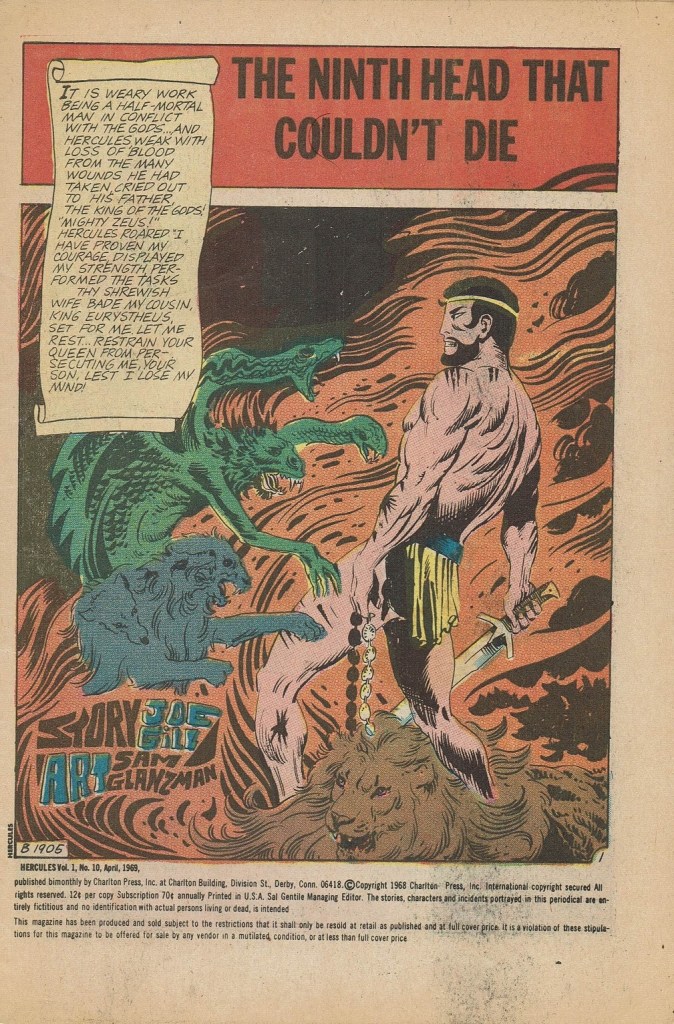 This issue of HERCULES was another book that I got out of the Modern Comics 3-Bags of comics that I purchased at the local Two Guys discount department store. And like the earlier issue that I spoke about, it wasn’t a comic book that appealed to me, but figuring that Hercules was an Avenger over in Marvel, I kept it anyway. Such oddball analyses and decisions are sometimes the lifeblood of collecting. Like the other books, it was a reissuing of a comic book originally published by Charlton years earlier, but I had no inkling of its pedigree when I first came by it. By this time, I don’t think i even really questioned the fact any longer that the numbering on the Modern books would jump all around–this was issue #10 and I’d earlier gotten #11. Those two were the only issues of HERCULES that Modern saw fit to reissue.