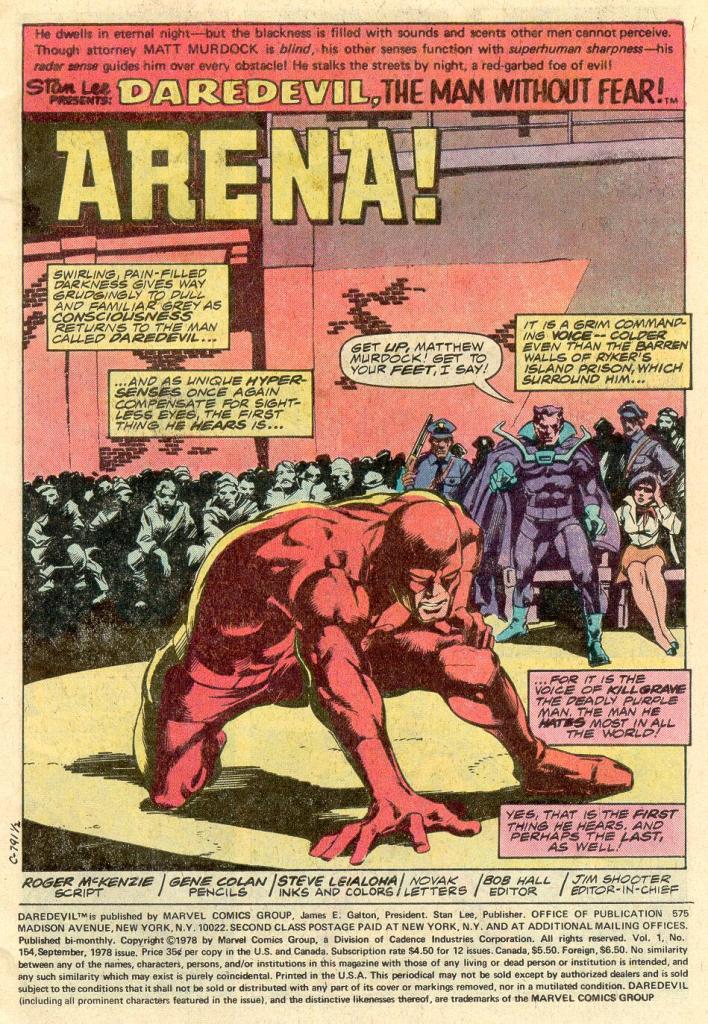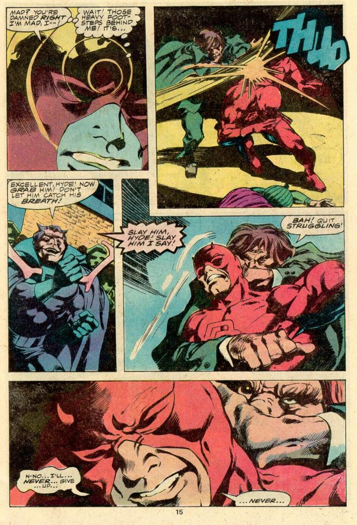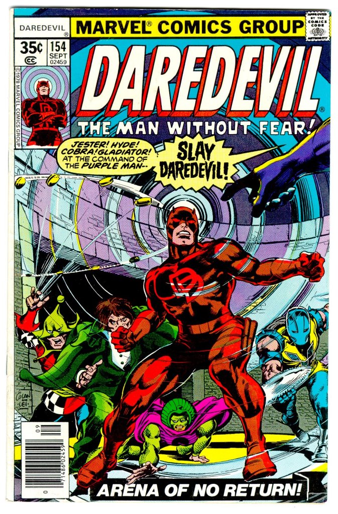 This issue featured the climax of the long-running subplot concerning Daredevil’s girlfriend Heather Glenn’s father, who had been controlled by the Purple Man into kidnapping Foggy Nelson’s fiancĂ©e and who later took his own life, unable to understand how he did what he had done. Sounds a lot like the synopsis to a soap opera, doesn’t it? In part that’s because this particular storyline had passed from writer to writer over a period of many months. It had been kicked off by Marv Wolfman, was continued by Jim Shooter, and was now wrapped up by Roger McKenzie. The latter had become the new regular writer of DAREDEVIL, but until he could make any plans of his own, he was obligated to tie off the stories already in progress.
