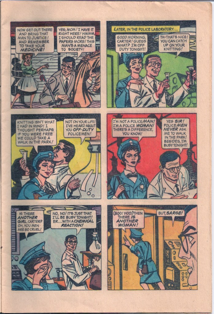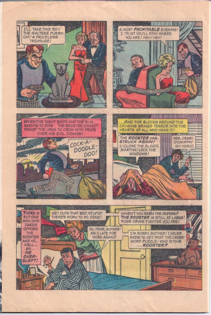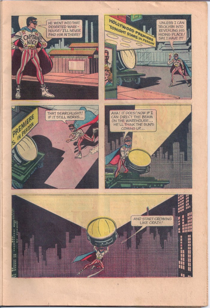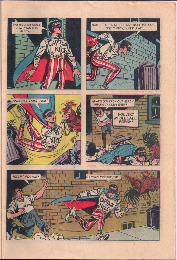 The authorship of the single issue is uncertain, but the artwork for it was provided by Joe Certa, who earlier had co-created the Martian Manhunter for DC. His efforts on CAPTAIN NICE were relatively crude and unappealing, with stiff figures and mechanical backgrounds. I’m sure the source material wasn’t all that inspiring for him.