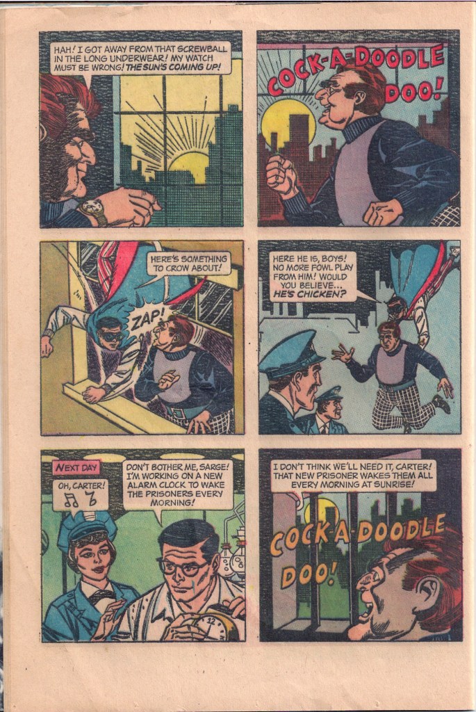 The first issue of CAPTAIN NICE, like all of Gold Key’s output at the time, was published without advertisements, and so filled the entirety of the comic. It contained four short Captain Nice adventures and a number of single page comedy strips. The inside and back covers were dedicated to photographs from the television program.