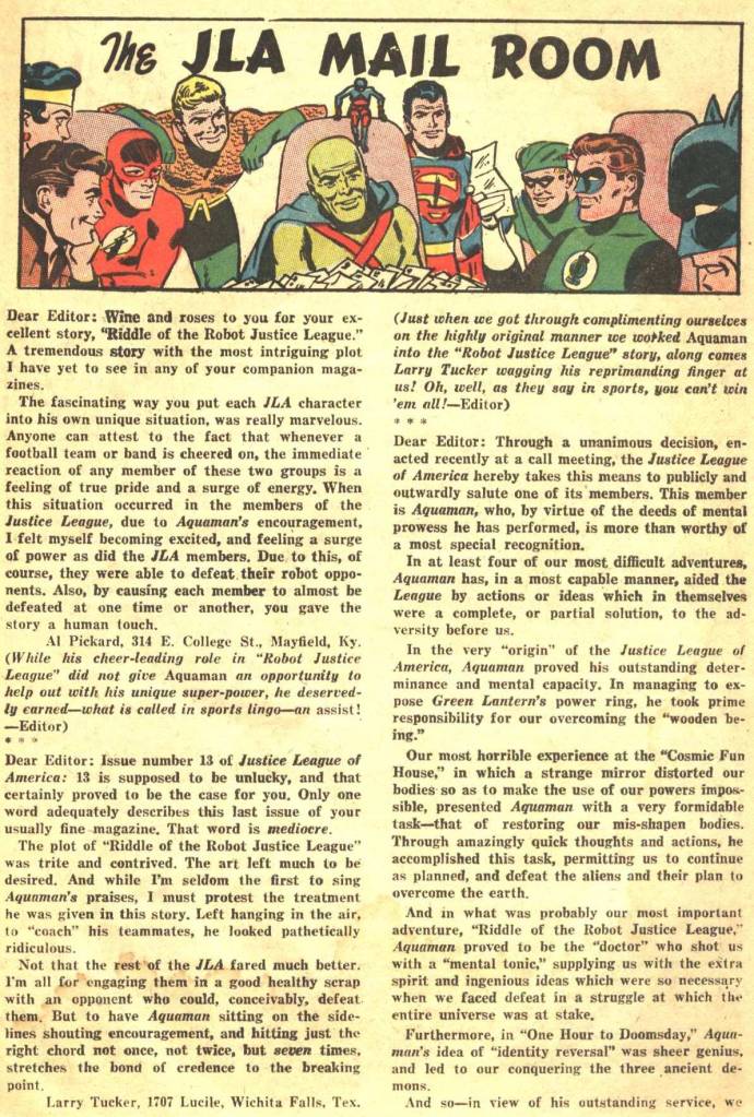 Back in the third chapter, and now we come to the twist. And it’s a bit of a cheat, to be honest. It turns out that the adventure that we had ben reading never happened at all. It was, instead, a fan comic sent to the League by super-fan Jerry Thomas. This is meaningful in that the character in question, and this story in general, was all a tip of the hat to two of the book’s biggest fans, Dr. Jerry Bails (often called the godfather of comic book fandom) and Roy Thomas (who had not yet become a comic book writer and editor.) The fictitious Jerry Thomas had come up with a made-up villain and situation that the Justice League couldn’t overcome. Concerned that some genuine villain might learn of the proposed plan, he sent it to the League in the hopes that they’d be able to find a way out of the death trap and ensure that they might be able to cope with any such real world parallel.