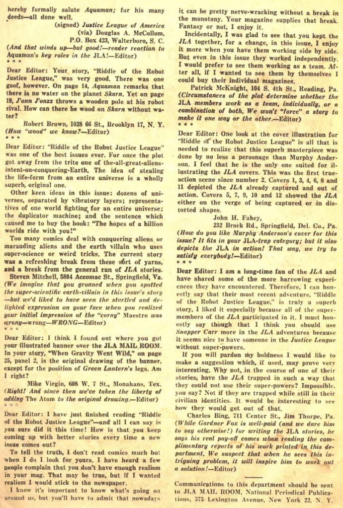 Next up was the double page JLA Mail Room letters page, filled with correspondents who had clearly been following Schwartz’s titles and who felt a kinship with them, even though the page was still anonymously put together. Schwartz is chummier on this page than most of the others we’ve seen–it’s possible that the specific fandom for Justice League brought this quality out in him more. JLA fandom was a huge part of the center of comic book fan activity in the early Silver Age.
