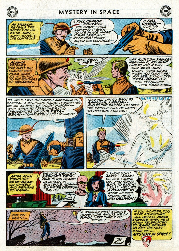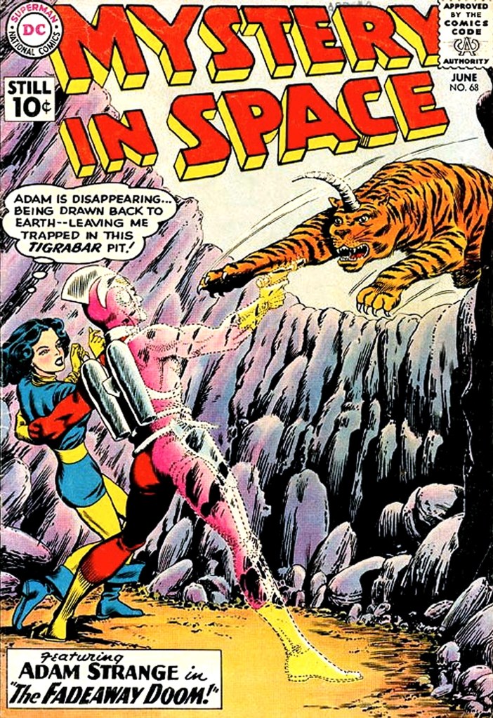 MYSTERY IN SPACE wasn’t a super hero title per se, but it straddled the line a little bit in its lead feature, ADAM STRANGE. Adam had a costume and fought bizarre menaces to his adopted planet Rann 25 Trillion Miles away from Earth. But he didn’t do so with fabulous super-power, but rather through scientific knowledge and courage and heart. Adam Strange was the thinking man’s hero, cast very much in the mold of John Carter, but with a greater emphasis on the power of brains over brawn. The creative team that produced most of the Adam Strange stories, including this one, was top notch. They were written by Gardner Fox, and illustrated by Carmine Infantino and Murphy Anderson. Infantino’s work was looser and more expressive than Anderson’s penciling, but Murphy put a nice slick finish on Carmine’s pencils. it was a great match (though not always to Infantino’s tastes.)