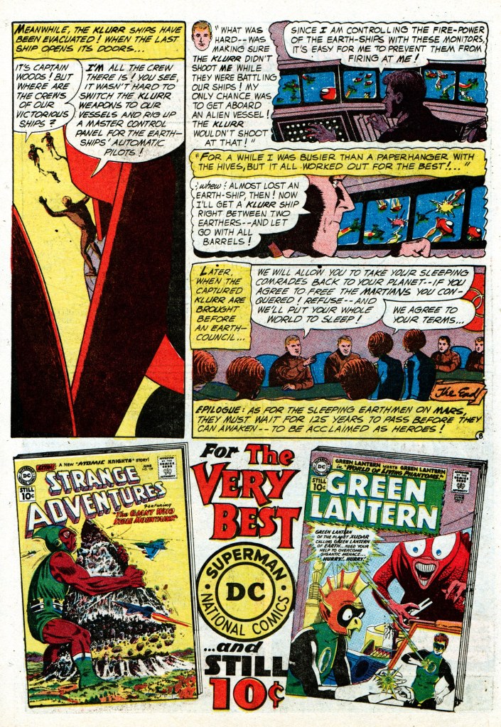 The story is a bit complex for its length, but it concerns astronaut Captain Alan Woods who is on a flight to Mars, when he’s exposed to a strange radiation band that envelops the red planet and which puts him into a deep sleep for 125 years. In that time, Earthmen have successfully colonized Mars. But when Mars and the Earth are threatened by the Klurr Empire of space, the forces sent to Mars are likewise put to sleep for 125 years along with the colonists. Only Captain Woods is left to prevent the remaining Klurr forces from devastating the earth–which he does using remote control drone spaceships which he coordinates from a central hub.