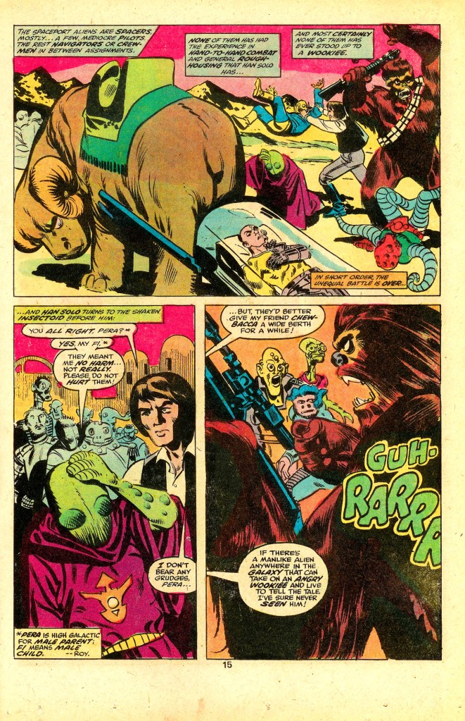 On the artistic front, the guy that George Lucas especially wanted on the adaptation was Howard Chaykin, based on his earlier Cody Starbuck series for STAR*REACH. Howard did the job without a whole lot of love for it (and because it looms so large, he’s unhappily been pigeonholed in some quarters as a STAR WARS artist above all else) bringing some of his sensibilities to the Galaxy Lucas built. I had honestly forgotten that he stuck around for a little while after the movie adaptation was finished, but clearly he did. And it can’t have been for the money–creators weren’t paid any sort of incentives on sales at this time yet. But consequently, there is a bit of a Chaykin influence on the story.