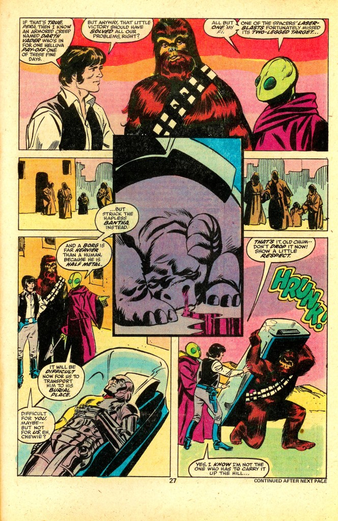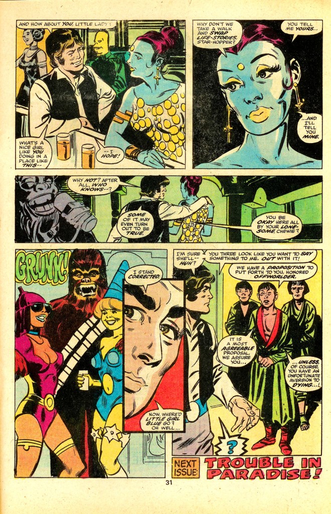 Of course, their procession is attacked by an overwhelming force of townspeople, and of course Han and Chewie have to fight for their lives. They win out, naturally, but the party’s Bantha is killed in the attack–requiring Chewbacca to carry the much-heavier-than-normal Borg the rest of the way on his back. And that’s it. Having been paid off, Han and Chewie head back to the Cantina to relax and refresh. But as the issue ends, Han is approached by a trio of robed men who say they have a proposal for him, one that he dare not refuse. To Be Continued! Truly, it’s not much of a story, and could have been told with any number of other space characters. But that was the challenge facing the creative team at this point. They needed to attempt to define what it was that made STAR WARS STAR WARS and deliver that–and all without lousing up anything that George Lucas might have been thinking of for the now-inevitable sequel.