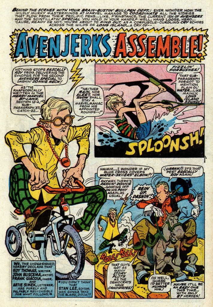 John Buscema did contribute a few pages to this Annual, and in a style that he didn’t often get the opportunity to use. One of the features that had been decided upon to run across all of the Annuals that year were humorous tales of how the creative team put that year’s story together. It’s a legitimately funny little story that Roy Thomas spins, with Buscema’s genuinely adept cartooning providing the visuals. I enjoyed it a hell of a lot. On the one hand, it’s hugely self-indulgent, but on the other, it did give a sense (albeit a fictitious one) about how a comic book like this one was put together. And that was information that I was hungry for. It also helped to characterize some of the creators in the Marvel bullpen, something that Stan Lee was always keen on doing.