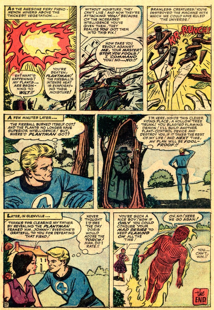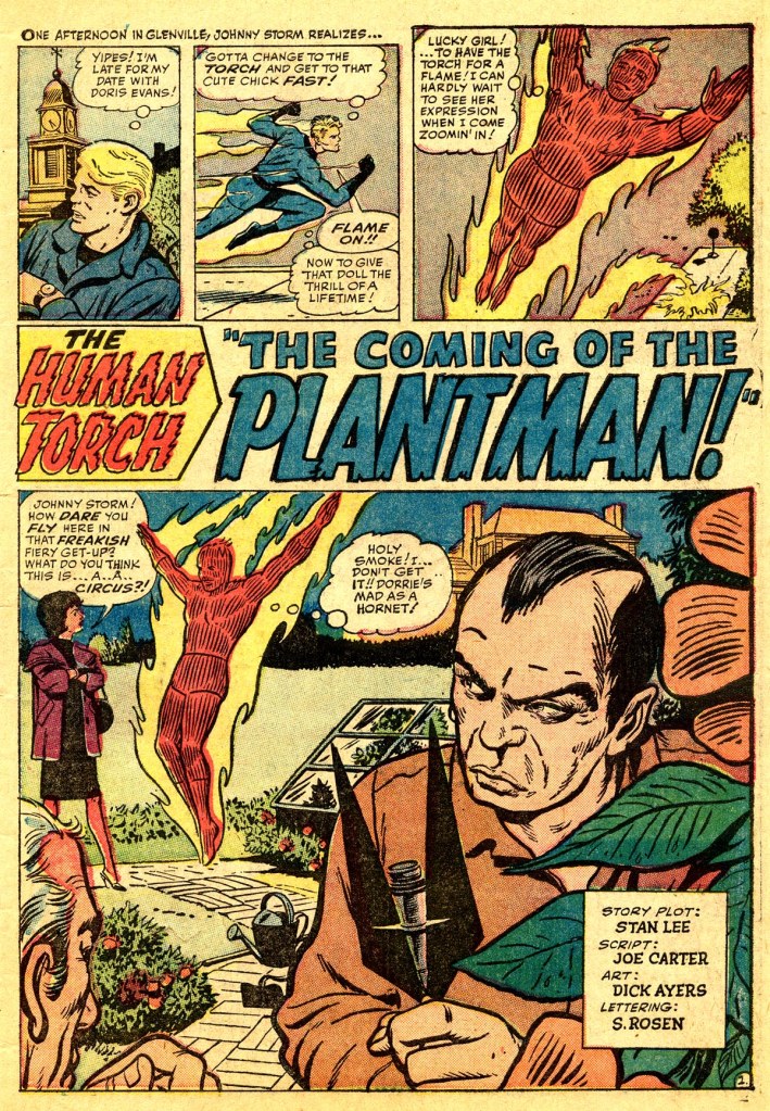 The story was illustrated by Dick Ayers, a real workhorse in the early Marvel days. His penciling style was always a bit idiosyncratic, lacking the dynamism and inventiveness of Jack Kirby. On the Torch strip in particular, all of his teenaged characters seemed to be much older–Johnny Storm was chiseled like a leading man, and his new girlfriend Dorrie Evans, introduced in this issue, comes across likewise as a full-grown adult. Ayers pretty much designs the new villain in this issue, the Plantman, based on Jack Kirby’s cover. Kirby had left most of the details of the costume obscured, so Ayers needs to fill in the blanks. What he comes up with is a guy in a slouch hat and trench coat with a bandanna mask–hardly the most impressive visual ever seen in comics. For all that, though, Ayers work was always solid and dependable, even if it wasn’t especially exciting.