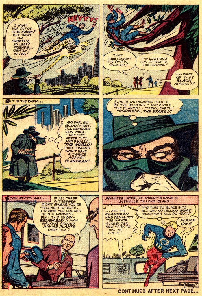 The story is typical of early Marvel hero adventures not plotted by Jack Kirby, but it’s even more silly than usual. The Torch has a new girlfriend, Dorrie Evans, whose wealthy father fires their gardner for dinking around with an invention that he claims will allow him to increase the intelligence of plants and make them do his bidding. The thing doesn’t work, until it’s miraculously struck by lightning. And then, the gardener adopts the guise of the Plantman to first get revenge on the man who fired him, and thereafter dominate the world. The Plantman’s gizmo doesn’t so much make the plants smarter as it makes them ambulatory and anthropomorphic in a manner that defies all logic. But it makes him a formidable opponent. When he frames Dorrie’s father for his initial crimes, the Torch vows to bring him to justice and restore his girlfriend’s good name.