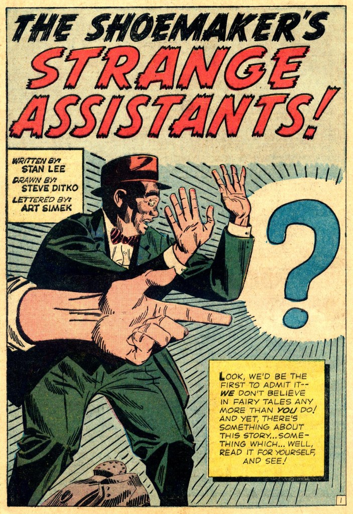 The real winner in the issue, as usual, is the final story, illustrated by Steve Ditko and dialogued by Stan Lee. Ditko’s hypnotic and slightly off-kilter artwork was a perfect fit for these short little creepy vignettes. The stories themselves were seldom memorable, but Ditko’s images would stick with you. This one’s a little bit less attractive than usual, as it appears to have been inked by George Roussos, uncredited. Anyway, it’s about a shoe repairman who fancifully tells children that little elves help him with his work. When he gets sick, he has to borrow money from a loan shark to pay for his operation–but thereafter he’s under the loan shark’s thumb, forced to generate more and more money for the goon. In the end, though, the loan shark discovers that the tiny elves are real, and what’s more, he’s shrunk down and put to work for the old shop-owner.