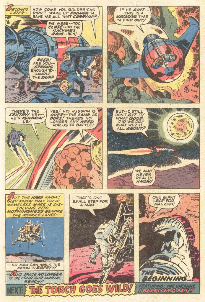 The destruction of the gizmo sends the entire island into self-destruct mode, and so Ben, with Reed under one arm and Johnny under the other, has to sprint for their Pogo Plane in order to escape the holocaust all around him. (Unfortunately, Stan had added a line in earlier about how the plane was just about out of fuel when it landed, meaning that it couldn’t have lifted off again here. Oops.) But the day is saved. The FF watch the Sentry fly off, his mission having ended in failure. And high up in the sky, the story closes out with astronaut Neil Armstrong taking mankind’s first step onto the surface of the moon. So it’s a perfectly fine twenty minutes of entertainment, but the story feels cramped and thin, both Kirby and Lee are forced to shortcut their way past certain events in order to fit everything in, and it’s clear that neither man is paying 100% attention to what he is doing. This, sadly, was the way of FANTASTIC FOUR during Kirby’s last days on the title. You’d see him explode with ideas once again after he left Marvel for DC and began his Fourth World epic.
