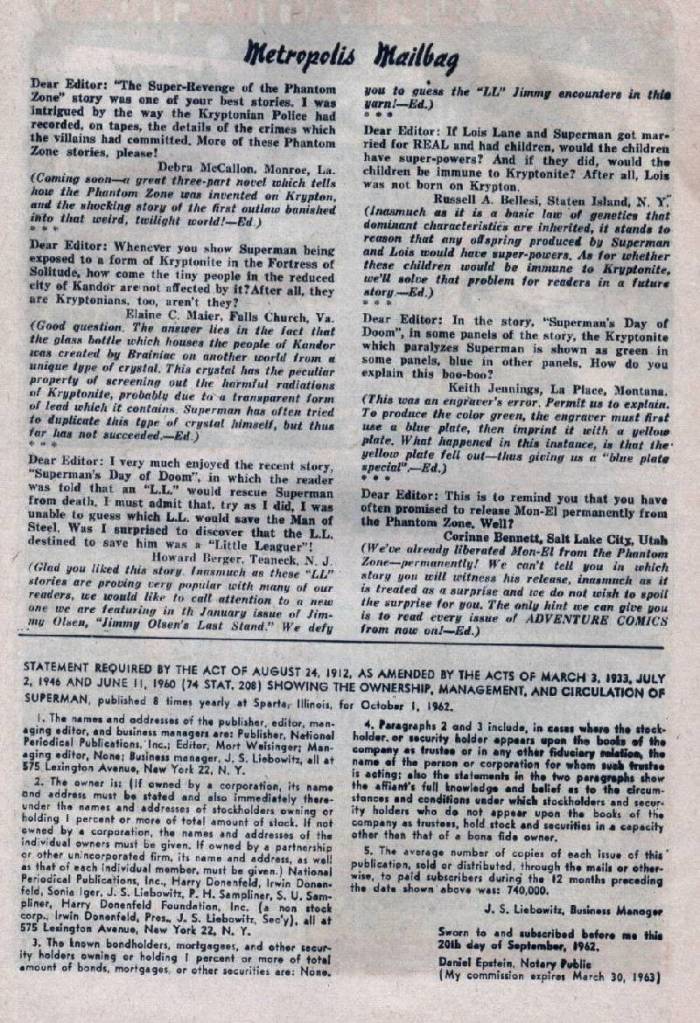 A pause between Chapters Two and Three for the Metropolis Mailbag letters page–which is truncated this issue so that the yearly Statement of Ownership, necessary to secure second class postage rights, can be run. These early Statements didn’t give much in the way of detail on the sales figures, but it does indicate that across the preceding year, the title sold 740,000 copies per month. That sure seems like a rounded off number to my eye, but assuming that it’s essentially accurate, that’s a remarkable number of copies for 1962.