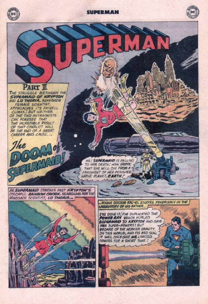 So right away, the story immediately starts doing all of the things it needs to do in order to make this sequence of events remotely plausible. In tis reality, Lois’s father is secretly a scientist who’s determined that the Sun is going to explode, destroying Earth as well. As in the case of Jor-El, he builds a spaceship to carry his infant daughter to safety on far-off Krypton, a world that he’s observed telescopically. Exposure to the Power Ray that powers her tiny craft gives Lois super-powers (and presumably enables her to withstand the crushing density of Krypton’s greater than Earth gravity.) She’s found and adopted by Khal-Kan and his wife Maural, who name the child Kandi-Kan. She grows up as a playmate of Kal-El of course, whose father Jor-El found a way to prevent Krypton’s destruction years ago. As she becomes of age, L:ois/Kandi of course adopts the heroic identity of Supermaid, using her super-powers to protect her adoptive homeworld. And it turns out that she is vulnerable to, wait for it, Earthite, fragments of her exploded homeworld that have reached Krypton, and whose radiations can only be blocked by silver for some reason.