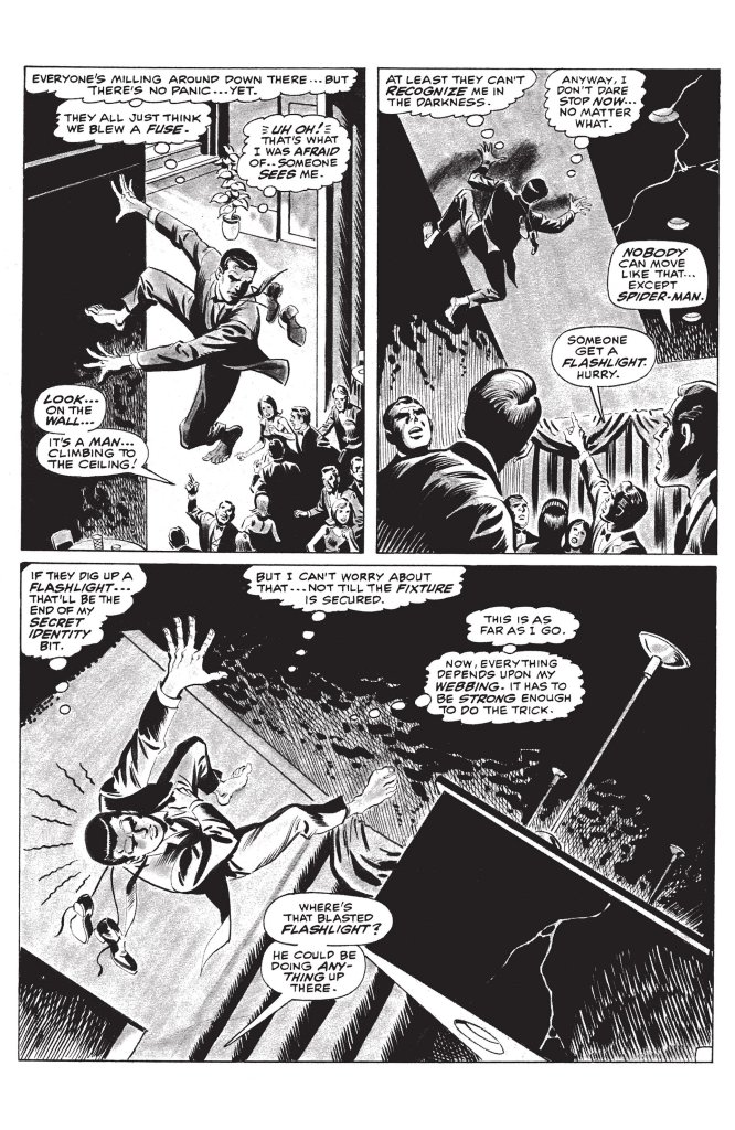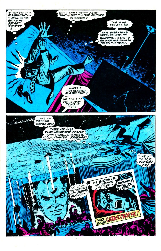 Back in Spidey land, Peter and Gwen have been able to work out their misunderstanding and so the couple does wind up attending the Raleigh Rally after all. While they’re there, Pete’s spider-sense alerts him to the fact that the stone ceiling on the theater is beginning to crack and buckle. Without the time to don his Spider-Man outfit, he instead shorts out the light and then scampers up to the roof, hoping to be able to reinforce the ceiling with his webbing. But that webbing doesn’t seem to be strong enough to do the job, and so everybody in the crowd below, including Gwen, appear to be doomed. To Be Continued! As you can probably tell, this was one of those manufactured cliffhangers that Conway and Romita were able to create at this point in order to break up the story. The cave-in happened in SPECTACULAR SPIDER-MAN as well, but it was dealt with as a single action sequence without any sudden moment of jeopardy.