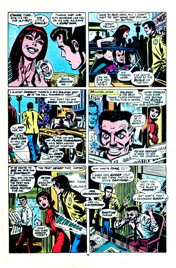 So what’s the story actually about? Well, Richard Raleigh is a popular new candidate for Mayor of New York City, As Spidey is swinging by one of his promotional billboards being put up, it is attacked by a huge man-brute called the Smasher. Spidey gets involved for a quick fracas, saving the lives of the two poster-mounters by allowing the Smasher to get away. From there, Spidey makes a beeline to the Daily Bugle editorial offices, where he’s able to retrieve his genuine mask and discard the stifling cellophane one he had been wearing. Becoming Peter Parker again, he’s invited to a big political rally being held by Raleigh that evening by Mary Jane Watson and Harry Osborn–MJ in particular is a big Raleigh booster. Pete needs to patch things up with Gwen Stacy, though, so he’s noncommittal about whether he and Gwen will be able to attend.