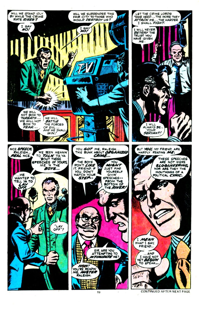 Elsewhere, Raleigh is giving an impassioned speech on television about how he’s going to crack down on crime and be a servant of the common man. He’s approached by a well-healed gentleman with gangland connections and warned off, but Raleigh tells the guy to go stuff it. Conway rewrote the entirety of this page completely from SPECTACULAR SPIDER_MAN, flipping its intent. In the original version, the man is a political consultant and Raleigh reveals to him that all he’s interested in is the personal power he can derive from the election. So Conway takes a few pages intended to showcase Raleigh as a villain and instead makes them about him being upstanding and honest.