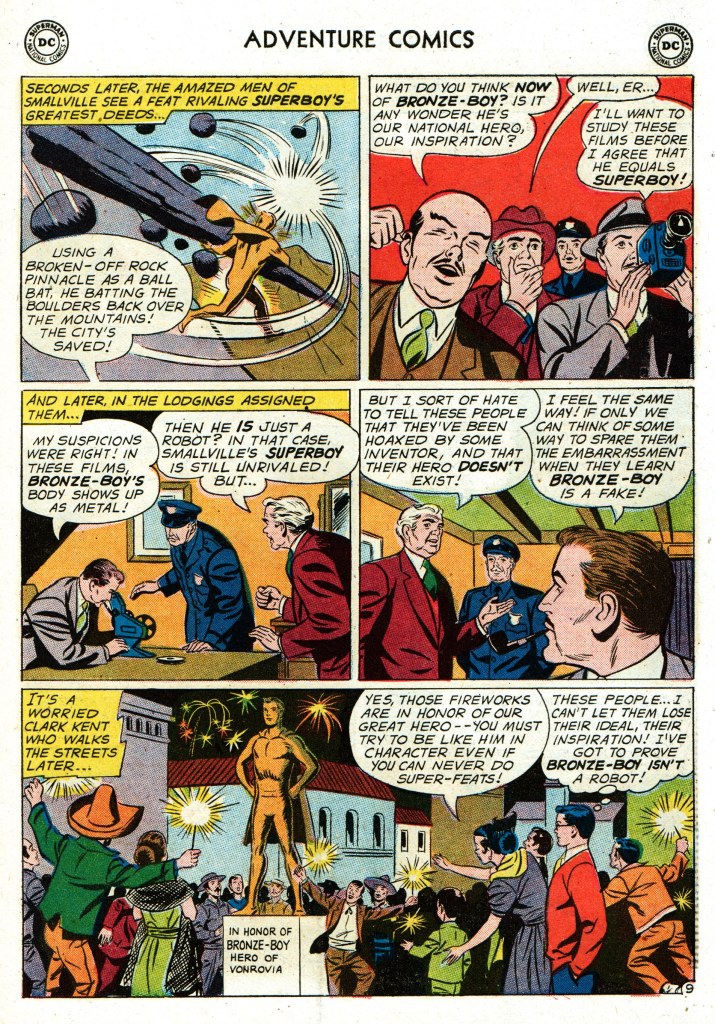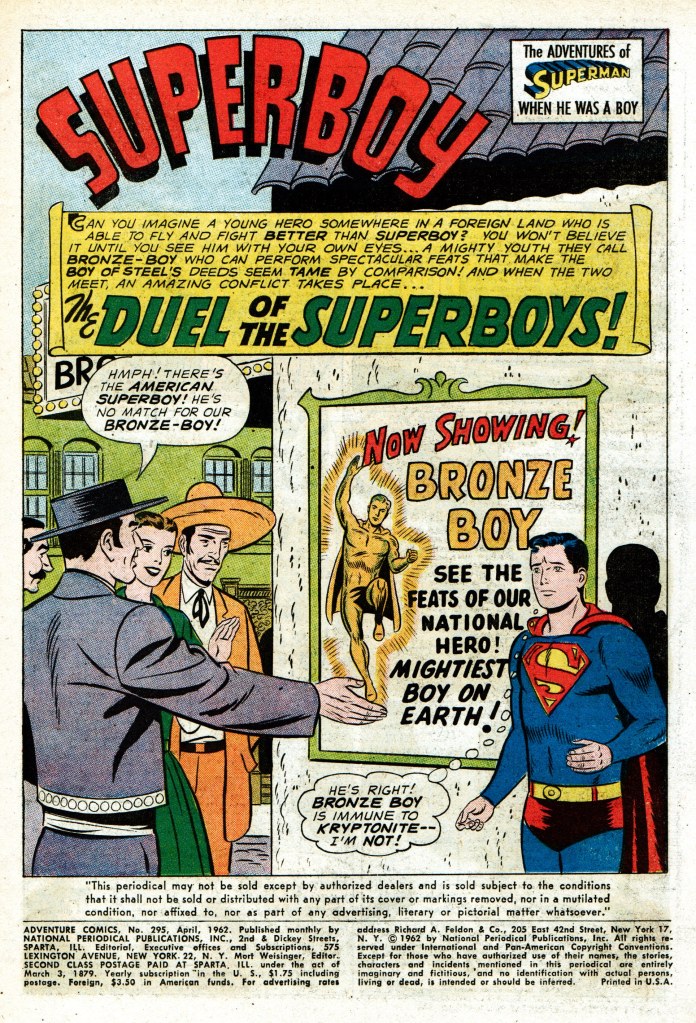 This one’s all about the people of Vonrovia, a South American nation that boasts their own super-powered young hero, Bronze-Boy. After a bunch of set-up in which it looks as though Superboy may be outclassed by this great hero based on the films he views of Bronze-Boy in action, it turns out that Bronze-Boy is actually Superboy himself, having been covered in metal by a space alien attack and then having lost his memory due to exposure to Red Kryptonite. But Bronze-Boy is such an inspiration to the citizens of Vonrovia that Superboy feels compelled to keep up the charade, enlisting local youth Juan to also pose as Bronze-Boy to help complete the illusion. None of this really matters in the slightest, but it’s diverting enough.