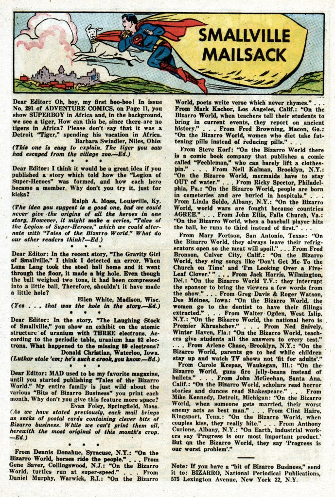 Next comes the Smallville Mailsack letters page, which continues to skew younger than most other similar letters pages of the era, at least a little bit. In this one, in recognition of his new feature, editor Weisinger had inaugurated a challenge to the readers to suggest their best ideas for Bizarro Business, and the audience definitely responded. Some of these ideas are pretty wild and out there–and that’s saying something when in reference to a strip as outlandish as Tales of the Bizarro World! In aggregate, it almost reads like a Yakov Smirnov routine: “On Bizarro World, the national hero is Premiere Khrushchev!”