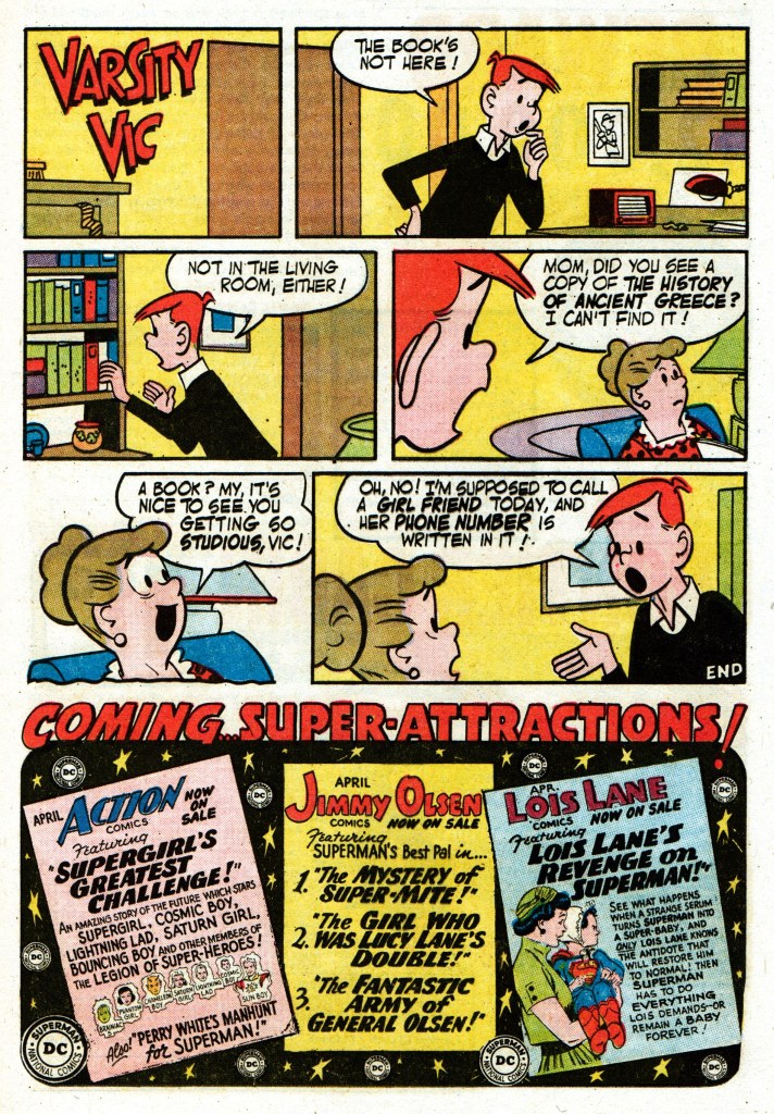 And before the issue completely winds down, Mort includes a second house ad for his other titles, this one in the tried-and-true Coming Super-Attractions format. Supergirl faces her greatest challenge (guest-starring the Legion of Super-Heroes)! Jimmy Olsen has three oddball stories going on! Lois Lane takes charge of Superman when he’s regressed to being a baby! (Baby stories were another sub-genre that DC couldn’t get enough of in this period. And the approved style of baby speak in most of them was no different from Bizarro speak. Make of that what you will.)