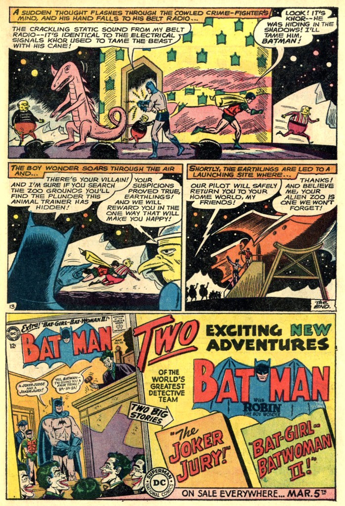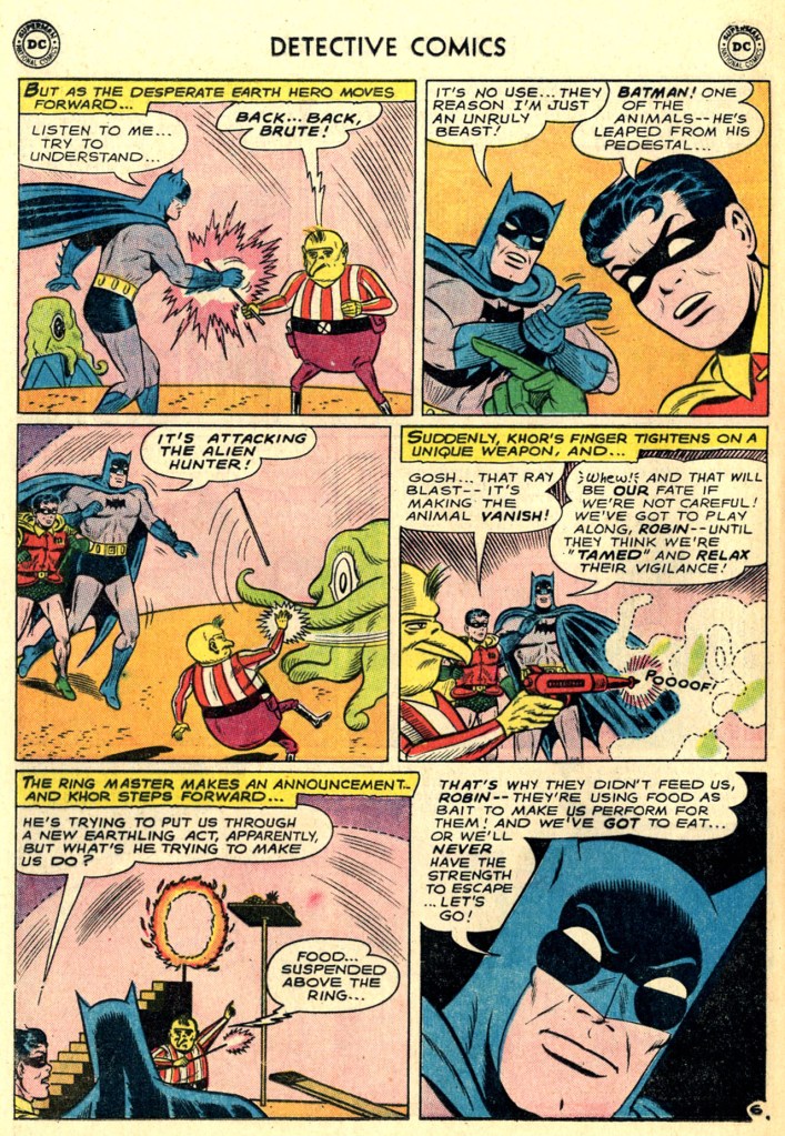 The story beings with Batman and Robin in Africa, where they’ve landed due to a malfunction in the batplane. Forced to defend themselves from hungry tigers, the pair have no way of knowing that they’re being observed by a group of alien hunters who have come to Earth looking for exotic specimens for their interplanetary zoo. Not recognizing Batman and Robin as intelligent creatures, the hunters corral them and spirit them away to a circus on an alien world. Unable to make themselves understood by their captors, the two Earth heroes have no choice but to perform for them or face the prospect of being disintegrated should they prove to be dangerous to the aliens.