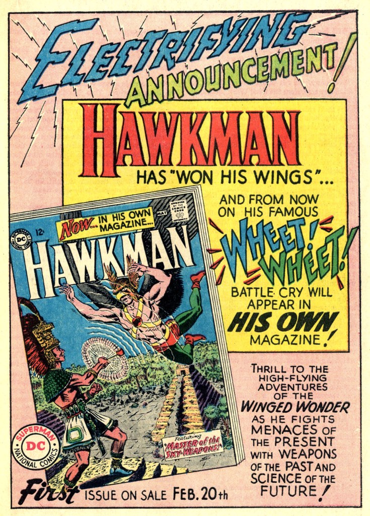 A pause here for a full page house ad composed by Ira Schnapp that heralded the promotion of Hawkman into his own magazine at long last. The Winged Wonder had been a cause celebre in organized fandom for a while, chiefly because he’d been a favorite of both Dr. Jerry Bails and Roy Thomas when they were kids. But despite their furious support, Hawkman tried and failed to win his own title a number of times before it eventually happened. Looking at this cover also gives a good sense as to how moribund the artwork in Batman was as compared to the other DC features of the time.