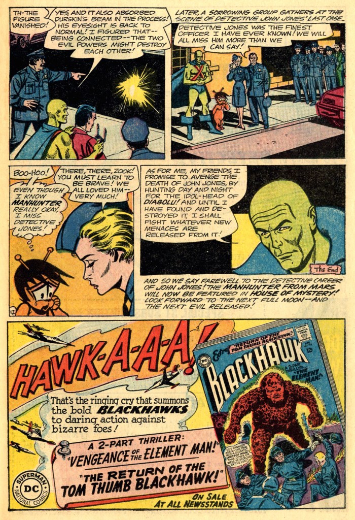 It turns out that the crook who stole the Idol in the first place has gained the power to shoot lighting bolts from his eyes. Cleverly, J’onn tricks the two menaces into firing upon one another, which destroys the cloud and eliminates the criminal’s lightning-vision. So the day is saved. But the Idol is still out there somewhere, ready to unleash another destructive menace, and so J’onn vows to locate it and secure it, doing so in the name of his supposedly-demised alter ego. A final caption indicates that J’onn’s adventures will hereafter move over to HOUSE OF MYSTERY, where he’ll take on a new secret identity as well as become a short-lived cover feature.