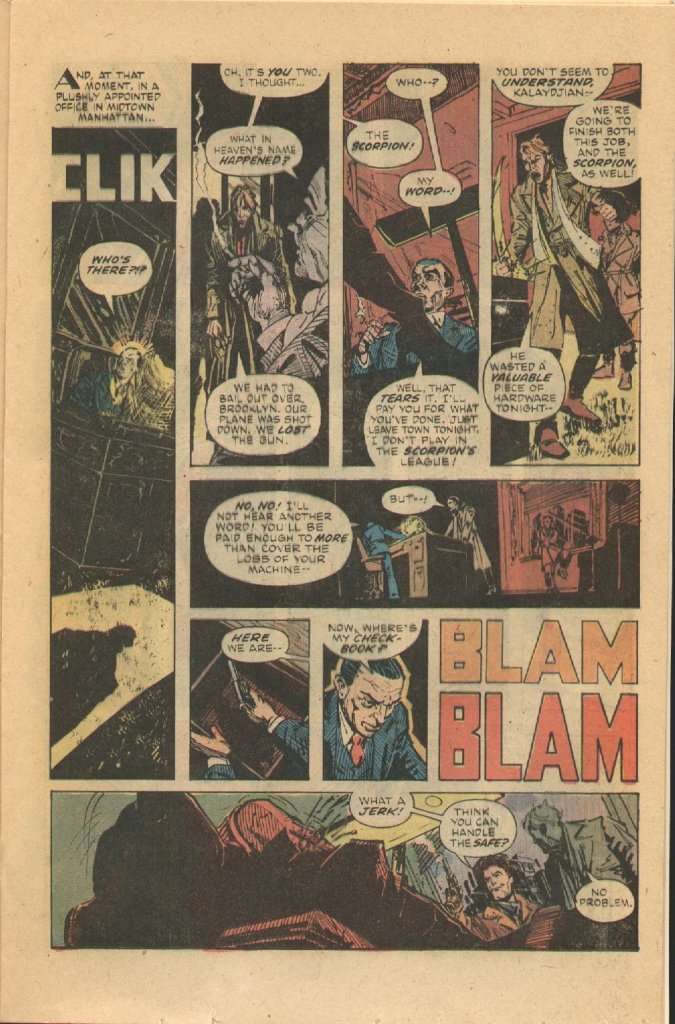 In 1974, i thought the Scorpion of the first two issues was clever but a bit top heavy in concepts. I thought trying to get the rights to a similar type of existing character with an extablisshed story might have helped,