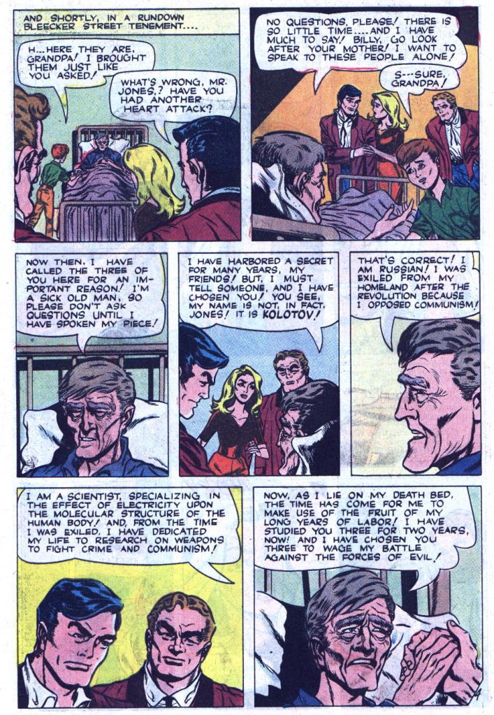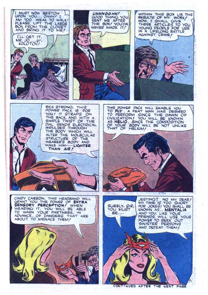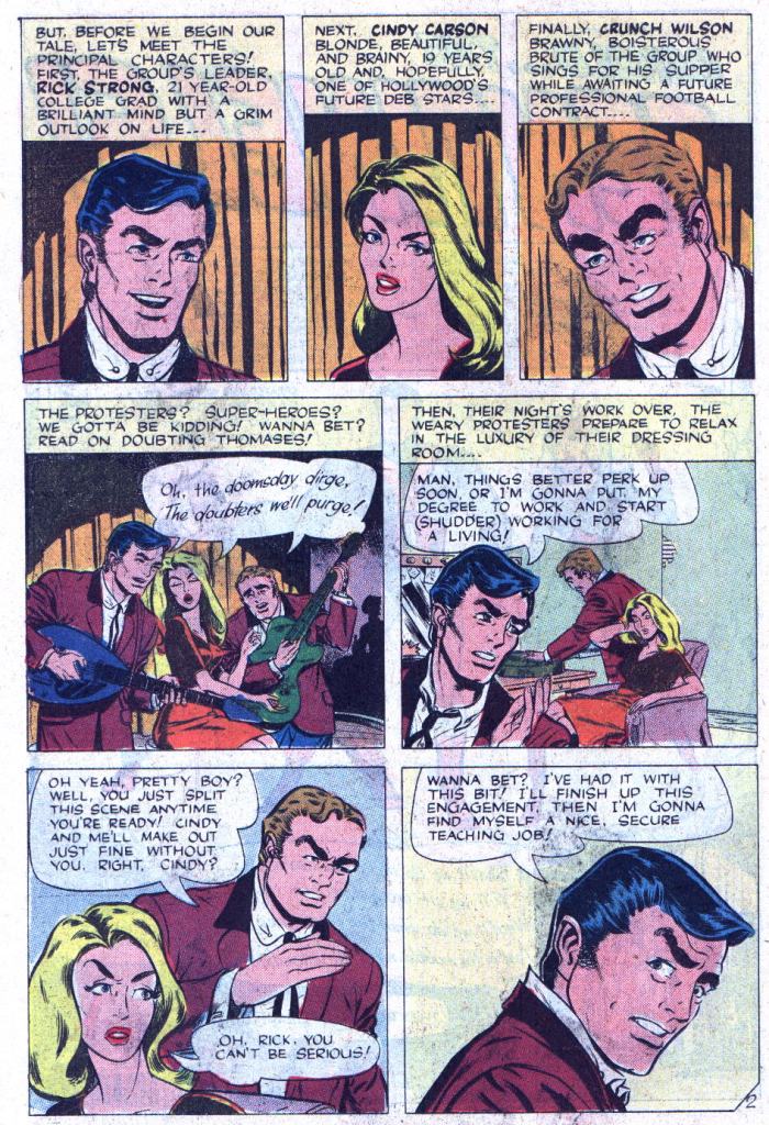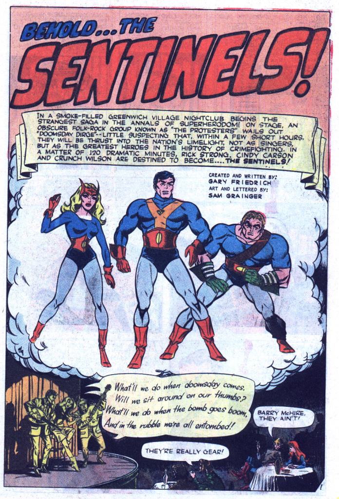 The Sentinels were a trio of young people–Rick Strong, Cindy Carson and Crunch Wilson–who had come together to form a folk singing group in order to pay the bills. It turns out that their landlord was secretly a Russian scientist working in the employ of a power-crazed madman known as the Mind-Bender. In order to foil the Mind-Bender’s schemes to dominate the nation, the Professor has created a series of special devices that will give whoever uses them superhuman powers. (in this respect, the Sentinels were like Tower’s T.H.U.N.D.E.R. Agents, whos superhuman abilities likewise largely came from gear that they used.) On his deathbed, the Professor gives the tech to the folk singers, recruiting them into a secret battle against his former benefactor before he himself passes.