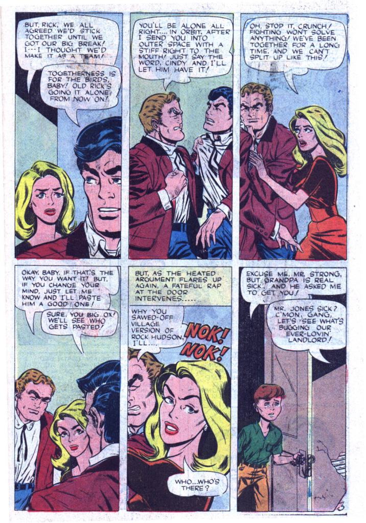 Accordingly, Rick Strong becomes Helio, armed with a backpack that allows him to fly by making his body akin to helium. Cindy as Mentalia gets a headband that permits her to read minds and will eventually also grant her some degree of telekinesis. And Crunch gets a pair of gloves that give him super-strength, which he uses as the Brute. They’re very much the Fantastic Four if the FF were also folk singers, and like the FF, they squabbled among themselves and threatened to fall out and had personal problems of a sort. The Sentinels was never as polished a strip as anything Marvel was putting out during this heyday, but it was still a pretty good, if fannish, emulation of the style.