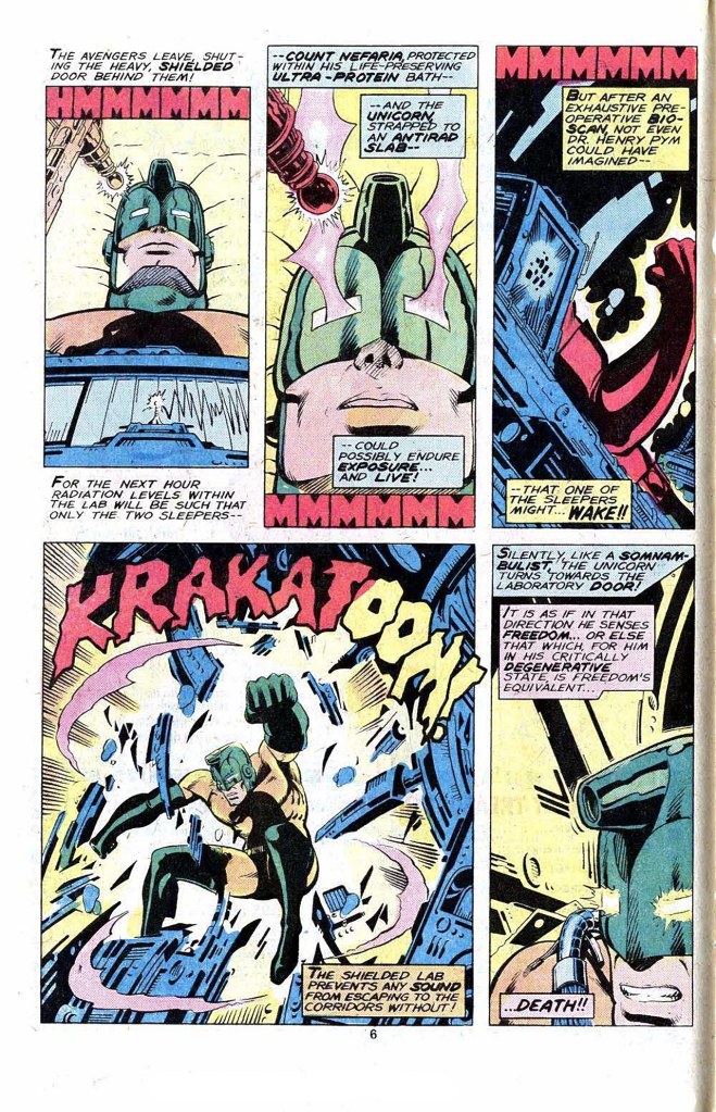 After last month’s fight, Iron Man has brought the catatonic body of his foe the Unicorn to Avengers Mansion, where he’s hoping that Yellowjacket will be able to cure him. The Unicorn had been sent to attack Stark Industries by an unseen mastermind, and Shellhead wants to find out who it was. He’d be in for a long wait, as this plotline got dropped in an issue or so as a new creative team came onto teh title, and it wouldn’t be wrapped up for some years. Yellowjacket sets the Unicorn up under the Avenger’s Revitalizer, and the heroes wander off, leaving the Unicorn to the company of the incredibly aged Count Nefaria, who is himself in suspended animation in order to save his life when the powers he stole in an AVENGERS three-parter prematurely aged him.