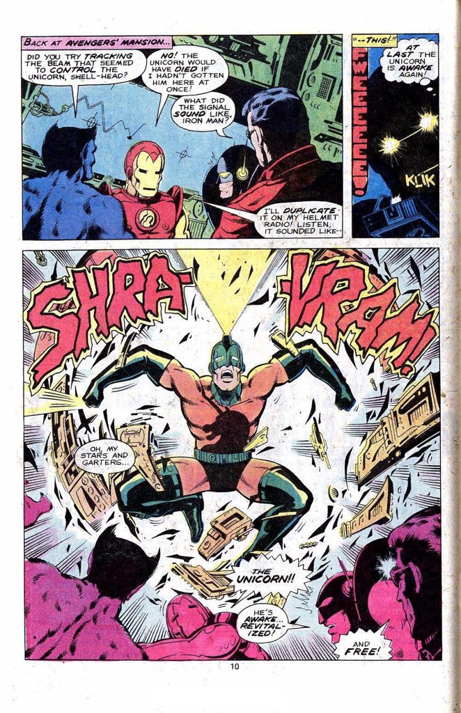 The Unicorn’s Master discovers that his broadcast signal to the Unicorn is being interfered with by another similar signal. Bereft of his master’s guidance, the Unicorn falls to teh ground and passes out–but not before a nearby wall panel rises up, revealing a colossal android that announces itself as Arsenal. What it’s doing in the workings of Avengers Mansion is a mystery, but it’s been activated by the signal that was controlling the Unicorn, and now it’s rampaging almost senselessly, itself waiting for orders from some unseen hand.