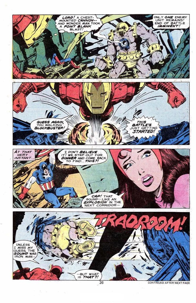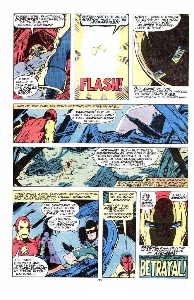 But before Arsenal can finish off the Avengers and no doubt because this is his magazine after all, Iron Man reappears, his armor’s power having been juiced up, and he clocks Arsenal in a cool splash page. On the receiving end, Arsenal chooses the better part of valor, and he disappears in a blinding light. The only apparent fatality in the whole brawl appears to be the Unicorn, who was in Arsenal’s path as it first emerged. So after two fights in which it can’t be said they really one even once, the Avengers are stymied by both the identity of the Unicorn’s master as well as what Arsenal was, where it came from and who was behind it. Iron Man swears to get to the bottom of the mystery–and a blurb tells us that this storyline will be followed up on in an upcoming issue of AVENGERS. This is pretty typical of a lot of 1970s Marvel books in that the whole issue amounts to a couple of seemingly-pointless fights, a bit of characterization and a few fun quips along the way, and not a whole lot more. So it’s fun, but feels a bit empty in the aftermath. It’s a situation that would begin to improve as the 1970s gave way to the 1980s, and as Jim Shooter’s new editorial structure allowed for feedback and revision on some of these stories at the plot stage.