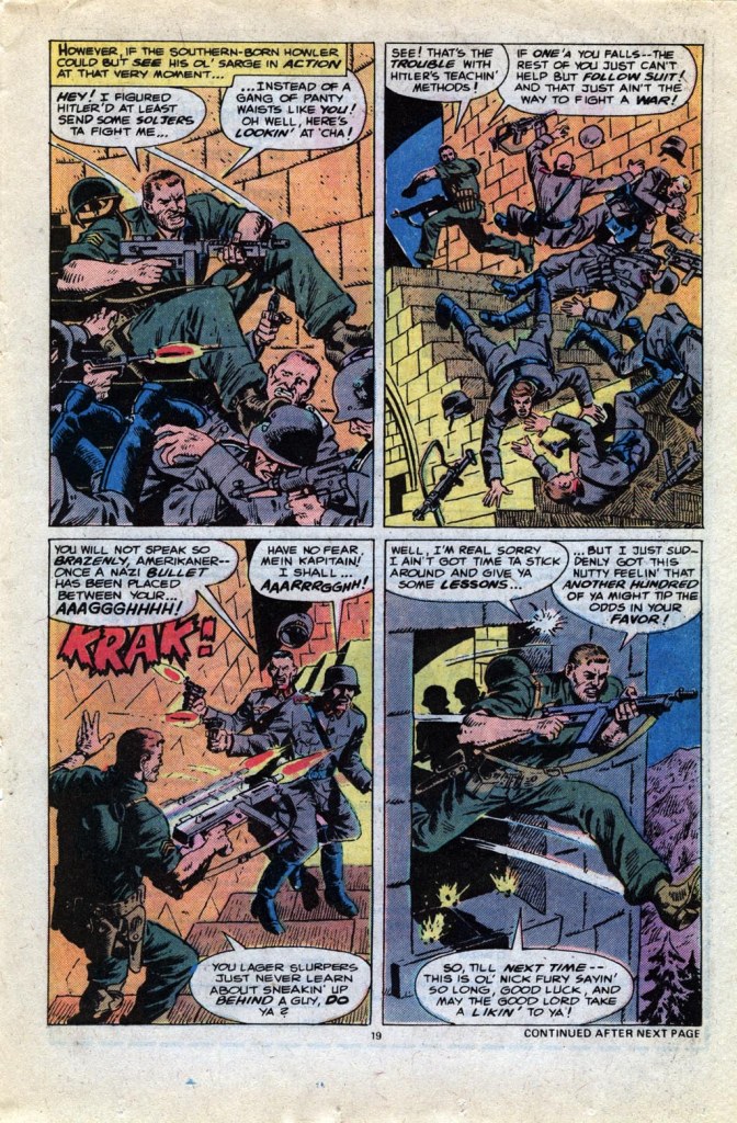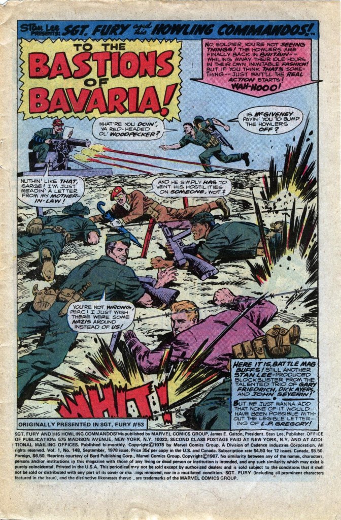 1. The scene with Sgt. Fury jumping out the window while holding his rifle ready to shoot anything in his path looks like it could have come from the early Mad or Panic comics, especially with the John Severin inks. Very funny stuff.