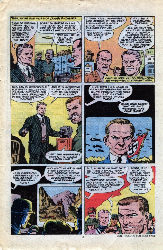 So what was on the agenda for Fury and his Howlers this issue? More of the usual, really. After an opening training sequence that serves to introduce and establish the large cast, the story gets down to brass tacks as Fury is summoned to C.O. “Happy” Sam Sawyer’s office. There, the men meet with an O.S.S. operative that the Howlers had encountered in an earlier story. That operative, Lee Mayer, has a mission for the Howlers: he wants Fury and company to break into a castle in the Bavarian Alps and abduct one Otto Froebe, a top military strategist who is responsible for a string of recent Axis victories. On paper, this task seems impossible–but Fury and his boys are comic book characters, they’re super heroes in khaki, so it’s simply another day on the job for them.