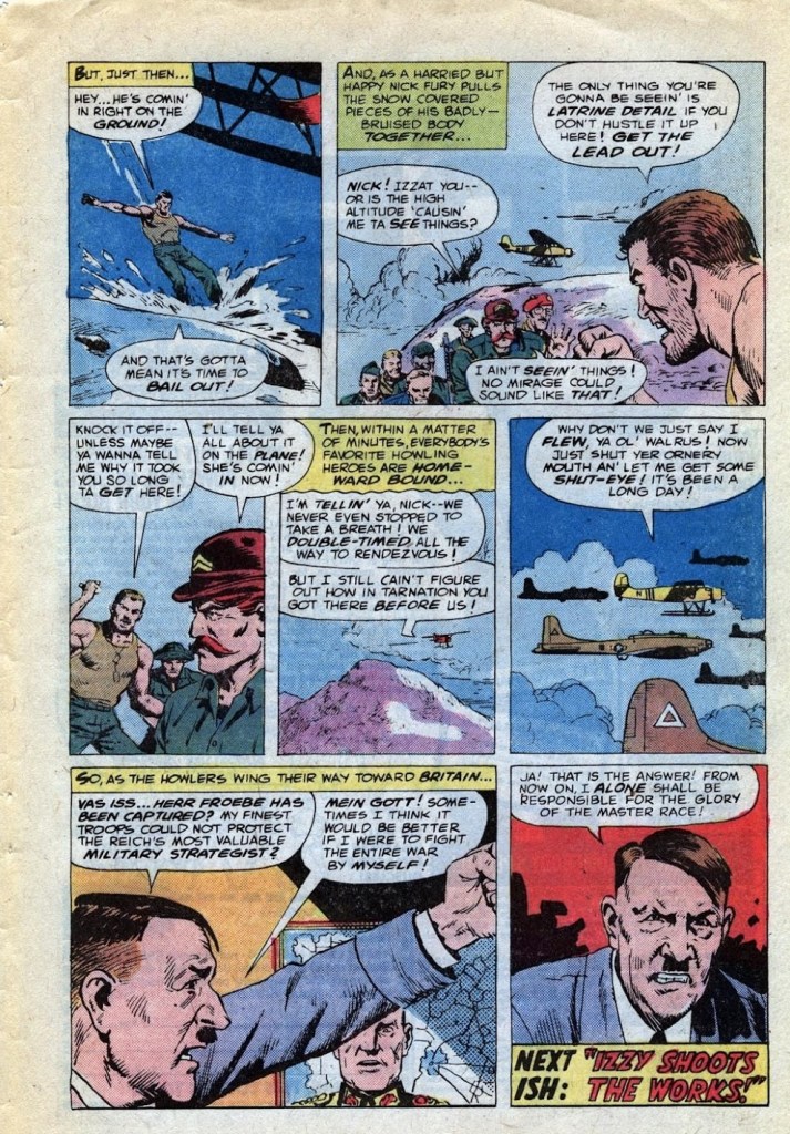 Fury is somehow able to break his multi-floor plunge by landing on the back of a passing Nazi motorcycle, which he promptly steals, tossing its rider into a nearby haystack in the approved G.I.Joe manner. But Nicholas isn’t out of the woods yet, and his pursuers guide him towards a huge gorge. Fury attempts to leap his bike across it Evel Knievel style, but things don’t work out any better for him, and he plunges into the ravine. Fortunately, having just survived one multi-story fall, a second one is a cakewalk, and Fury is able to get a toehold on the far end of the gorge and then use his belt and torn-up shirt as a lasso to help pull himself up to safety. By this point, the evac plane is coming in, and Fury is able to grab onto its landing gear and use it to fly himself to safety,. Seriously, it’s a ridiculous escapade by any stretch, but it’s presented in such a matter-of-fact manner that a reader really has no choice but to go along with it all. And the issue winds up as so many of them do, with Hitler shaking his fist and cursing the incompetence of his men, having been beaten by the Howlers once again.