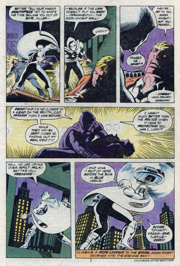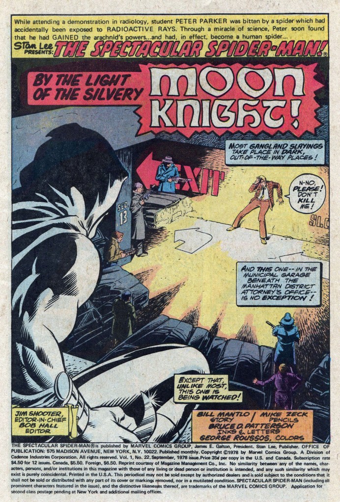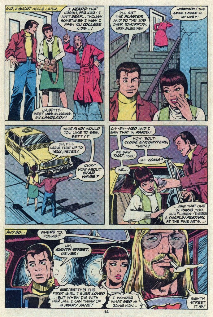 The issue opens with Moon Knight attempting to intervene in a gangland slaying of an informant who turned evidence on the criminal organization, the Maggia. The crescent crusader shows up in time to engage in an establishing fight scene, but he’s not able to keep the snitch from getting gunned down. What’s worse, with his last breath, the guy tells Moon Knight that the Maggia are on to his true identity as a NY cab driver. This isn’t great news for MK, although his Jake Lockley identity is at this point just a disguise he puts on when he needs to trawl the streets for information, so it isn’t the end of the world if he needs to take Lockley off the board. Meanwhile, after some light comedy shenanigans, Peter Parker and Betty Brant head out on an awkward date. Betty had recently returned to the series over in AMAZING SPIDER-MAN, having separated from her husband, Ned. But the magic just isn’t there between her and Peter any longer.