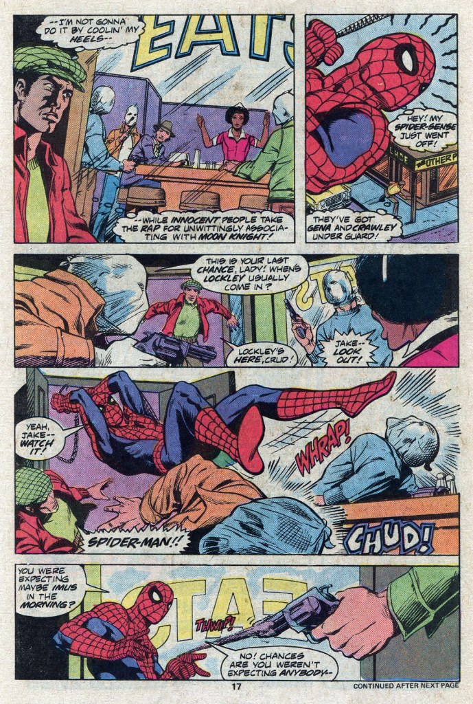 Meanwhile, Moon Knight has resumed his identity as Jake Lockley in an attempt to lure out the Maggia hitmen who have been dispatched to put him in the ground. He finds them at Gina’s Diner, a regular hangout of Lockley’s where he would pick up information from the customers and staff. Unfortunately for Moon Knight, Spider-Man is swinging by overhead, blowing off some steam after his gone-bust date with Betty, and his spider-sense alerts him to trouble in the diner. So Spidey crashes in and fouls up Moon Knight’s plan to get the Maggia gunsels to take him to “Big M”, the new Maggia leader.