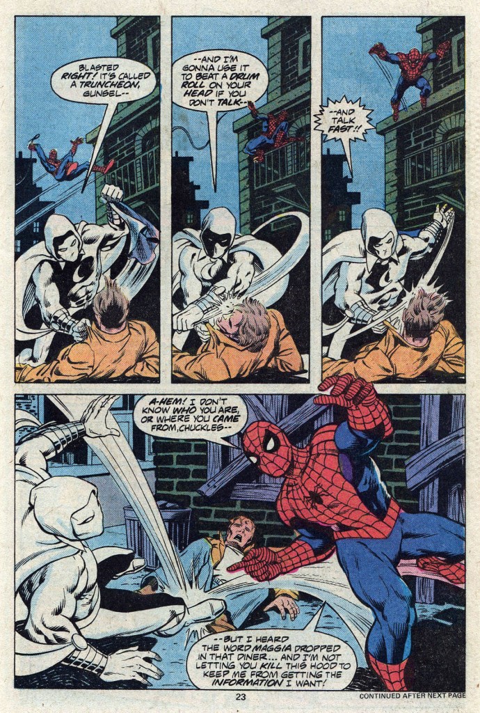 The web-slinger mops up on the Maggia gunmen, all but one who escapes out the front door. Seeing his opportunity, Lockley changes to Moon Knight and pursues the man, cornering him and attempting to intimidate him for information. Unfortunately, Spider-Man catches up with the pair at that moment, overhears the wrong thing out of context, and assumes that Moon Knight is also working for the Maggia and attempting to silence the hitman before the wall-crawler can get any information from him. This leads to that age-old classic, the two-heroes-fight-each-other-due-to-a–misunderstanding plot.