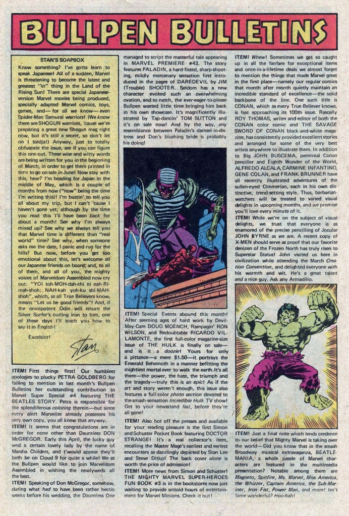 I haven’t shared one of these in a while, but every month still brought a new Bullpen Bulletins page with gossip about the creative staff and salesmanship about upcoming releases. I’m not sure who was writing the page at this point–Scott Edelman had done it for a couple of years, but he was gone from Marvel by this point. I enjoyed getting one of these every month, as there was really no other place to get information about upcoming comics or the people who made them. Looking at it now, the format seems tired, the repartee just a bit dated and soft. The page wound up being phased out in a couple of months, although Jim Shooter would later bring it back in the early 1980s–but that version felt even more labored and corporate to my ear. But honestly, the difference may have been my age and my openness to such a thing.