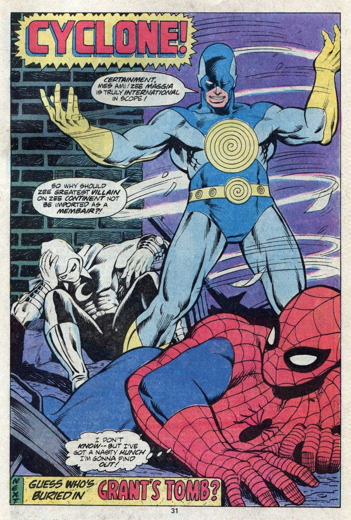 While the two heroes dance with one another, the Maggia goon is able to drop a quarter into a payphone and alert his superiors as to what is going on. So as the issue wraps up, Moon Knight and Spider-Man’s tussle is broken up by hurricane winds–signaling the arrival of an old Spidey sparring partner, Cyclone. The French super-criminal is in the employ of the Maggia, and he’s been sent to wipe out both Spidey and Moony. To Be Continued!