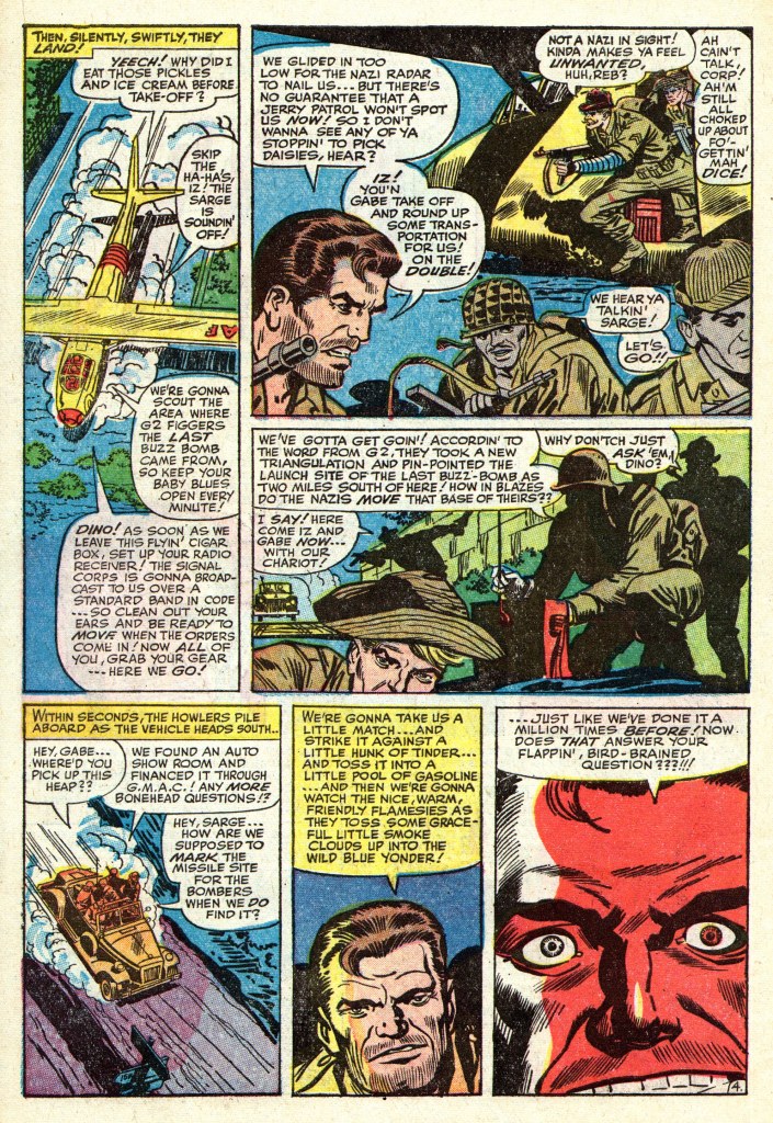 The issue opens with the Howlers enjoying a little bit of R & R at a local Pub when the area comes under attack by German V-1 rockets–or “buzz bombs” as they were commonly called due to the sound they made before impact. While the Howlers all get away without a scratch, the area is demolished. Back at base, “Happy” Sam Sawyer gives Fury a new assignment: he is to seek out and locate the base that is the source of the V-1 attacks on England so that Allied bombers can put the place out of action. So it’s a quick glider hop across the English Channel into Germany for our boys, just another day at the office for the Howlers.