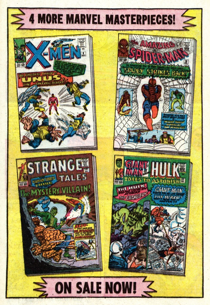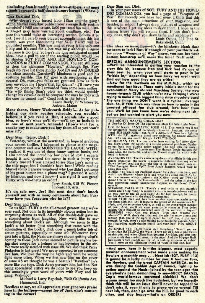 The letters page also includes the Special Announcements Section, which is now hosting an early version of the Marvel Checklist that will become one of the backbones of the eventual Bullpen Bulletins page. The big news here is that the next issue of SGT FURY is going to guest star Captain America and Bucky. This would have been Bucky’s first actual story appearance in a Marvel title–he’d been shown for a panel here or there, and everybody knew that he’d been killed in action when Captain America was frozen in suspended animation. But this was readers’ first opportunity to see him in action. What’s more, it served to further cement SGT FURY in as a title that mattered to the early Marvel continuity–even if you were solely a super hero reader, you had to keep an eye on it regardless, which was more than could be said for the western or girl humor books.