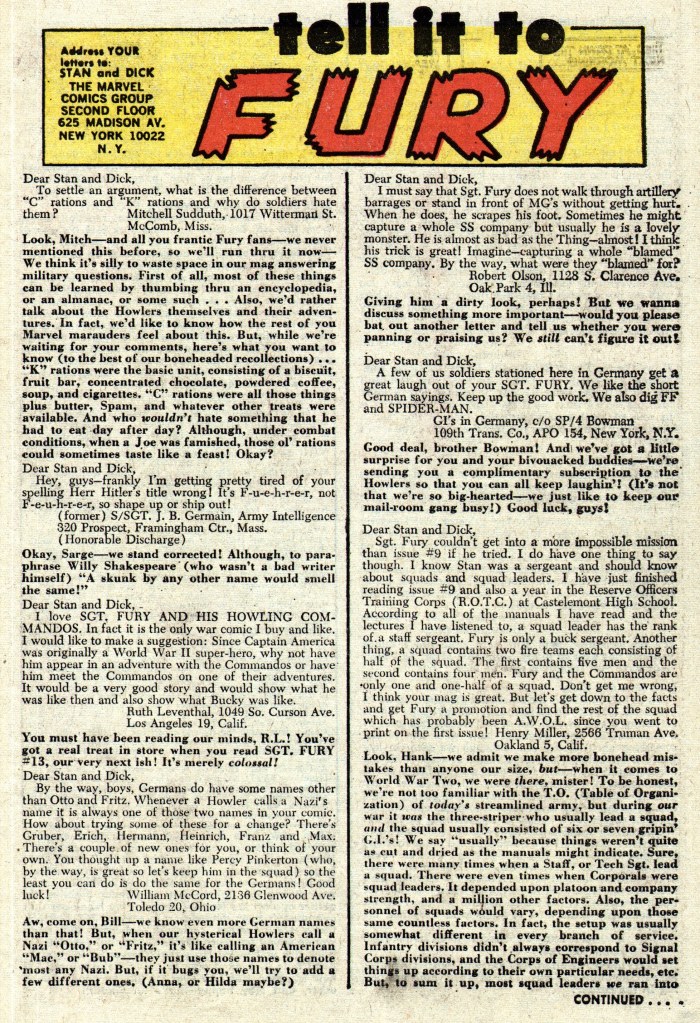 And the book wraps up with the typical two-page Tell It To Fury letters page. At this point, Lee is changing the letter salutations to Dear Stan and Dick, illustrating Ayers’ position as the regular artist of the series.