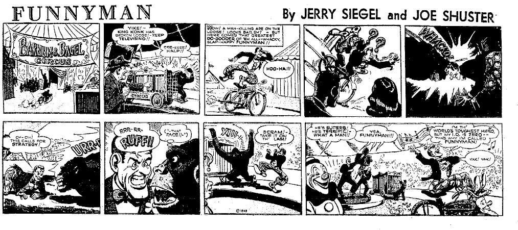 While this legal battle was going on, Siegel and Shuster needed another avenue through which to make a living, as clearly National wasn’t going to be giving them any work. They threw in their lot with Vince Sullivan and his Magazine Enterprises publishing house. Vin had been an editor in the early days of DC until his own falling-out with its owners, so he was sympathetic to Siegel and Shuster’s situation. In an attempt to show that they were really the driving force behind Superman’s success, Jerry and Joe put their heads together to come up with a new character who they hoped would eventually eclipse their Kryptonian brainchild. This new character was called Funnyman.